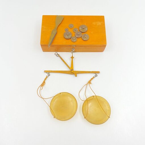 Kabinamos žalvarinės svarstyklės (max 100 g) dėžutėje su priedais.