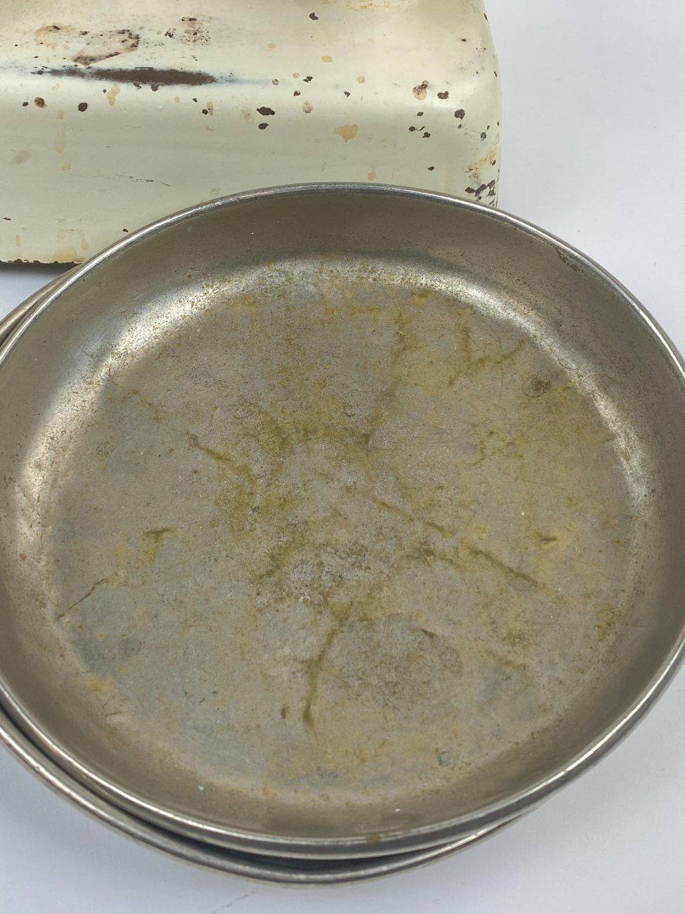 | Papildoma informacija | Su svareliais svertų iki 5 kg, bet svarelių nėra, tai sveria iki 1 kg. Matomos amžiaus ir dėvėjimo žymės, subraižytas paviršius, emalio pažeidimai, rūdys, dėmės. |