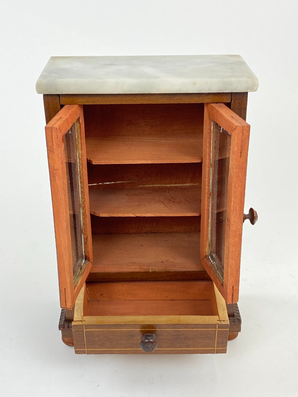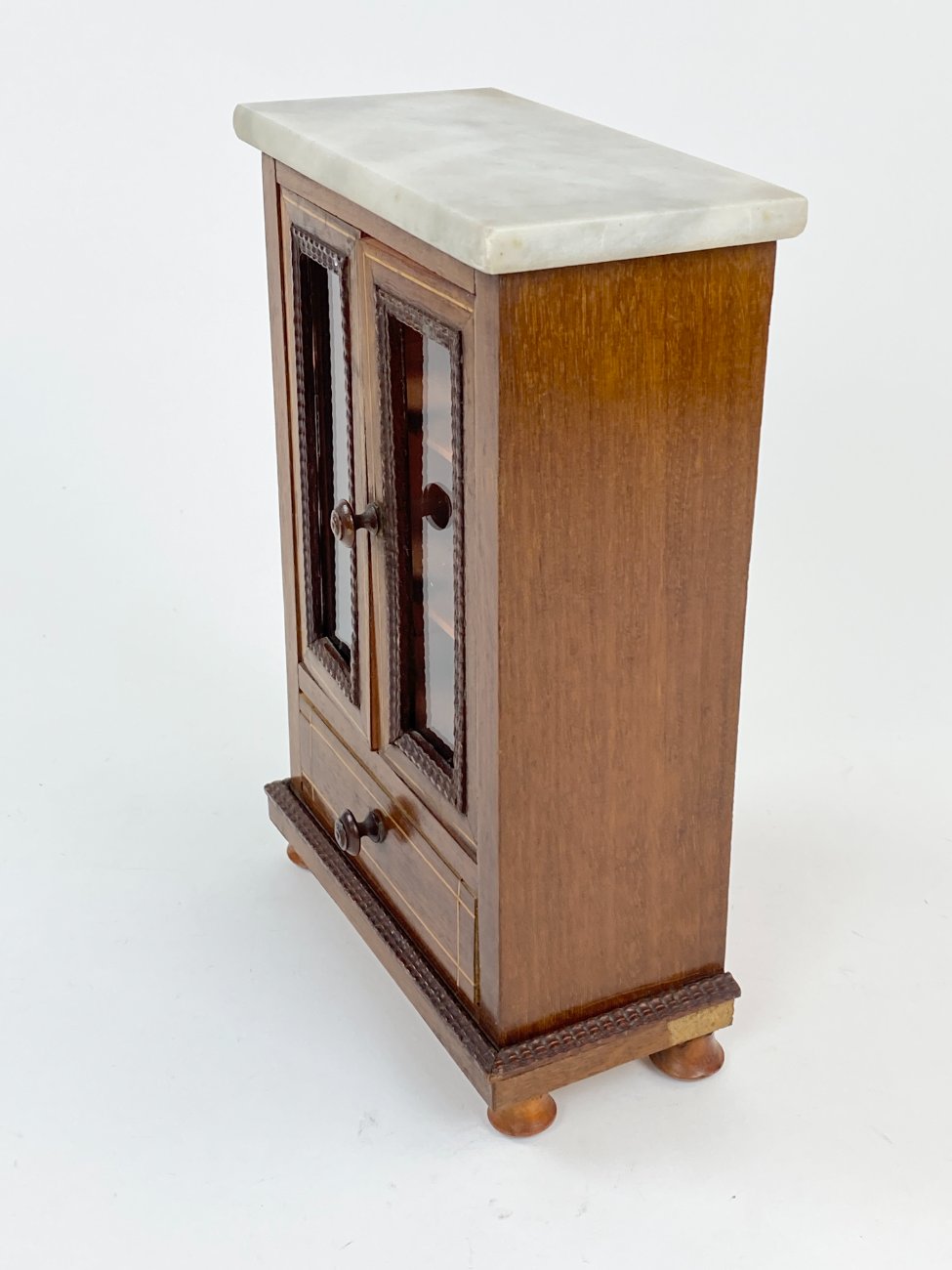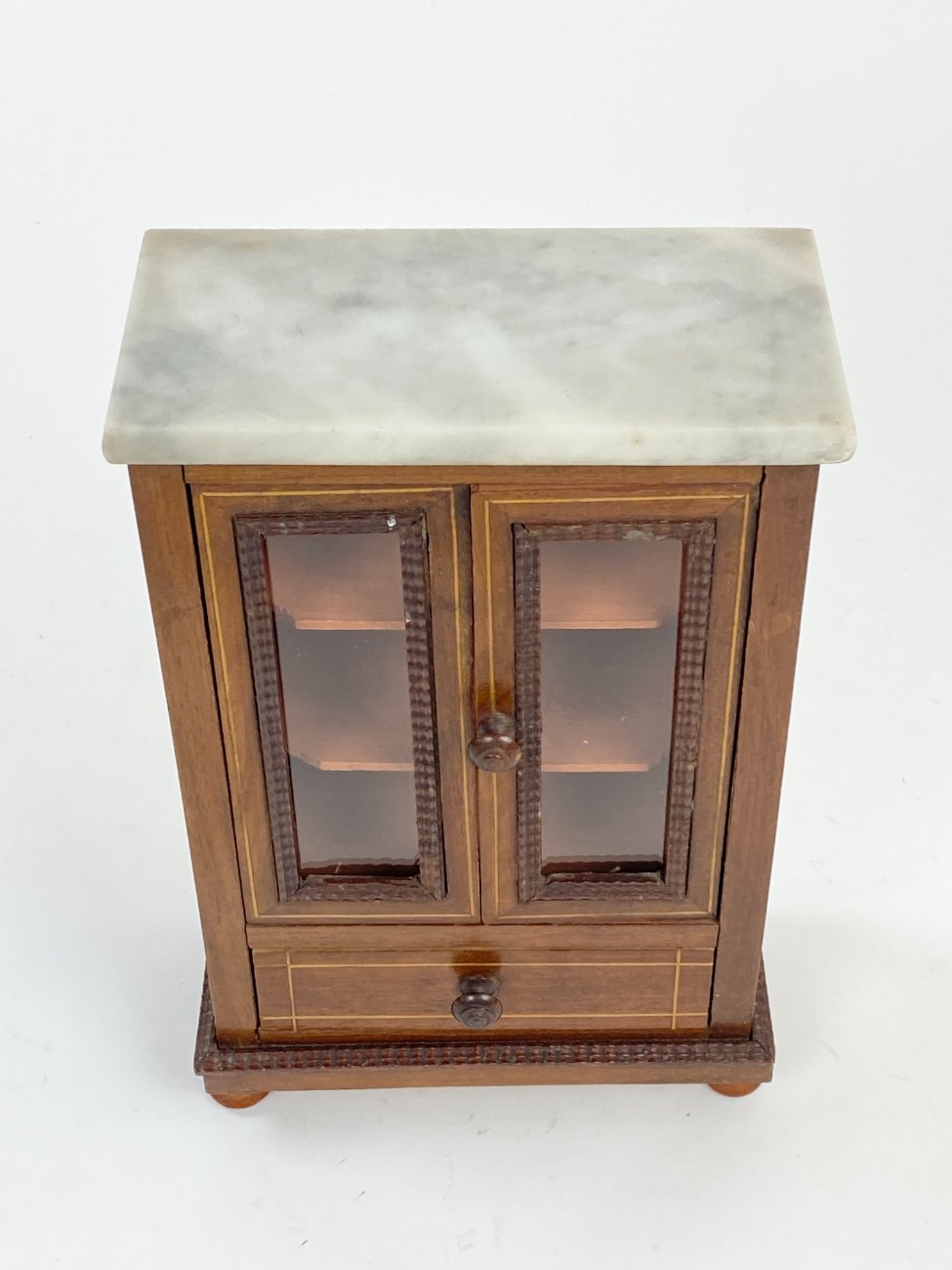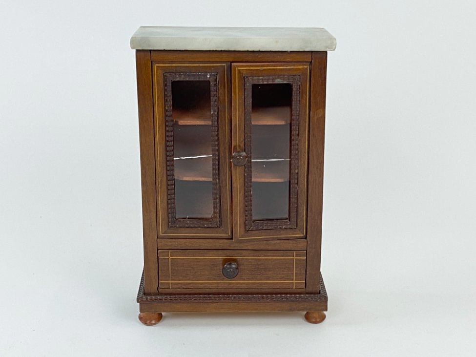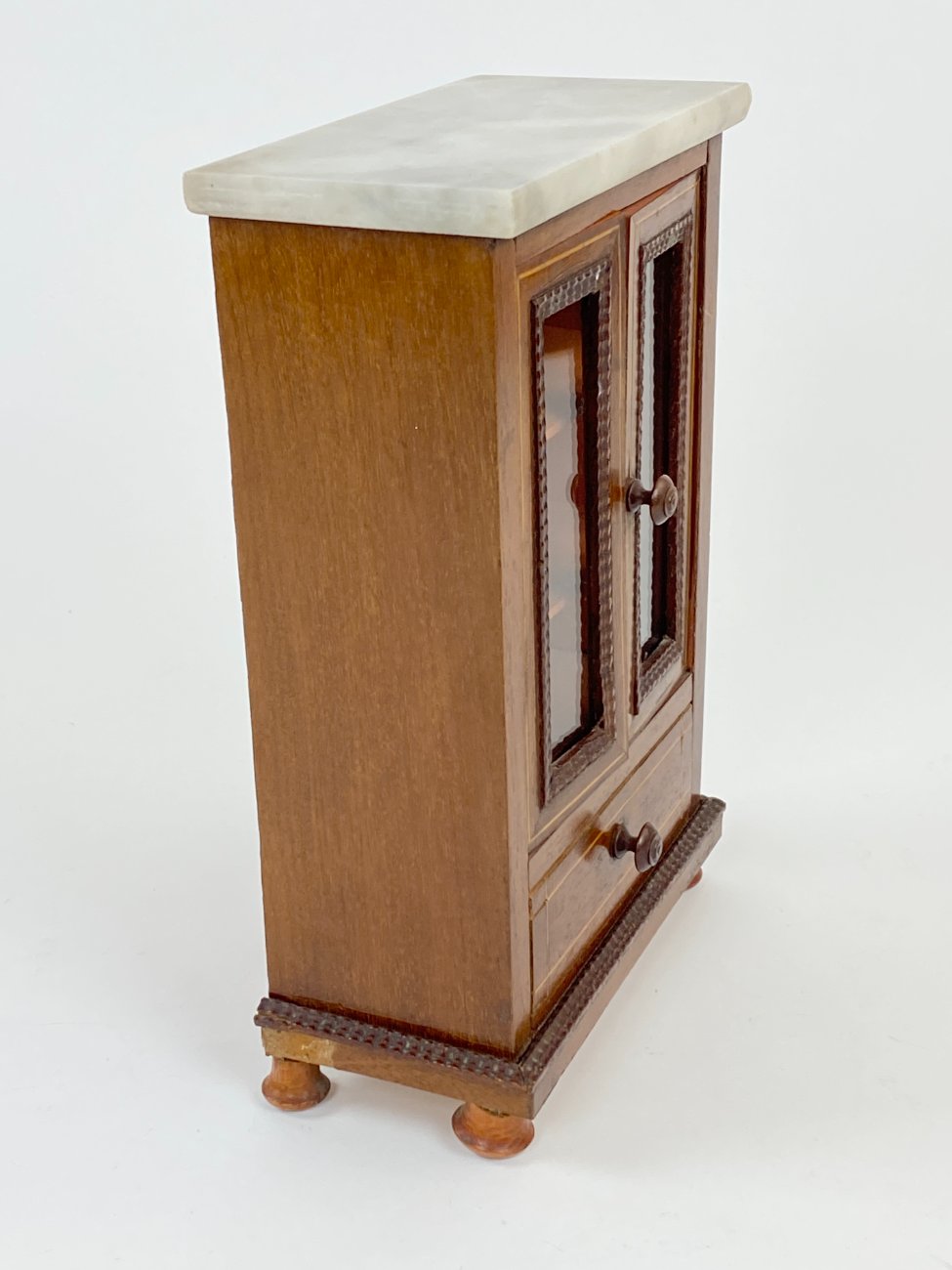 Žaislinė lėlių spinta iš medžio su akmeniniu viršumi.