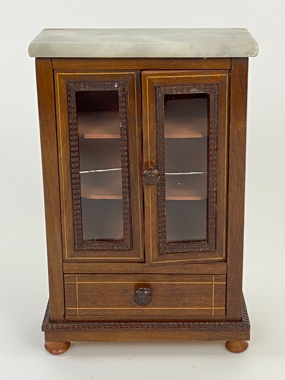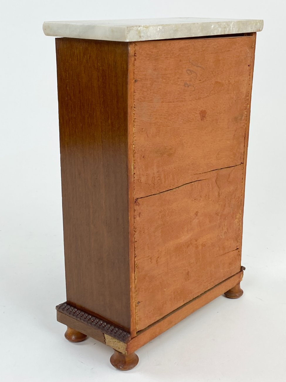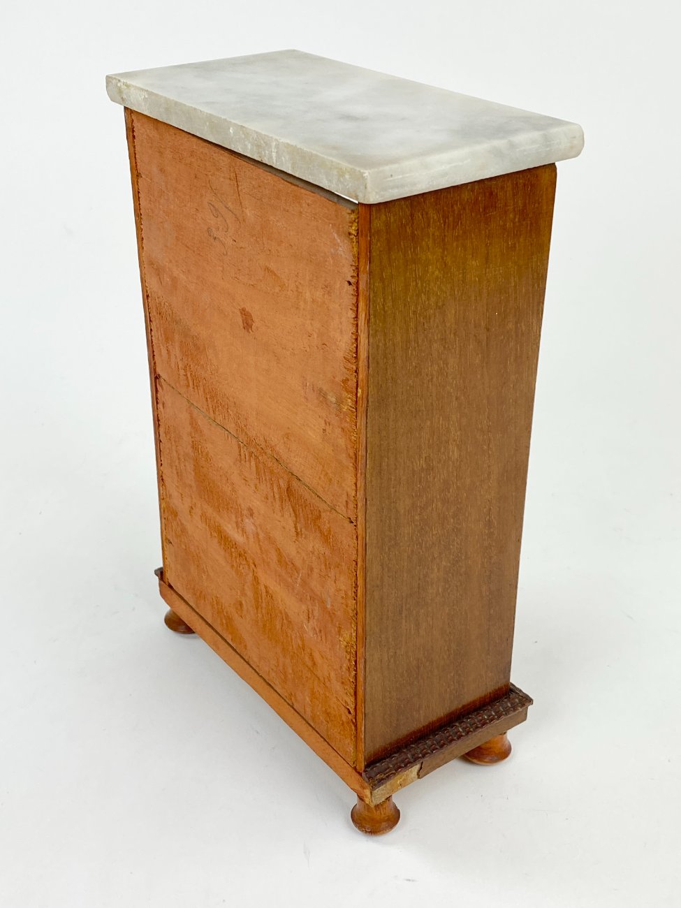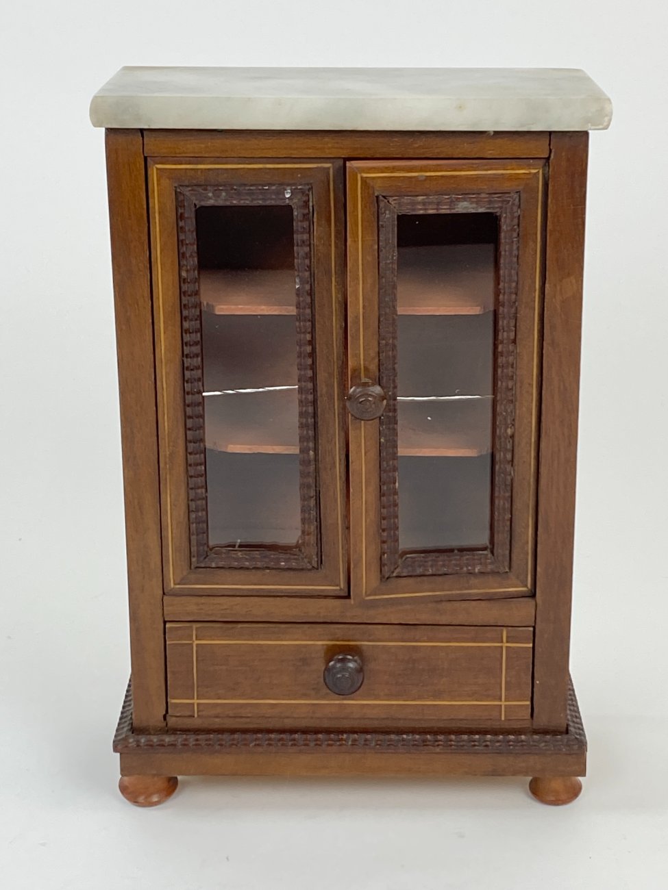 Žaislinė lėlių spinta iš medžio su akmeniniu viršumi.
