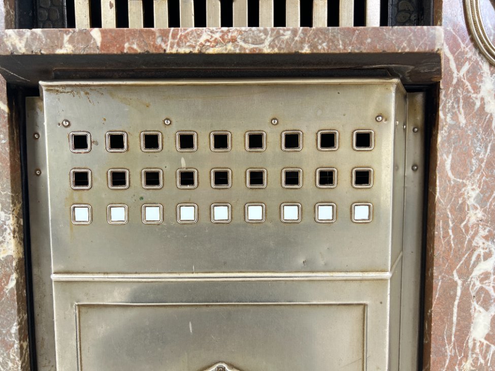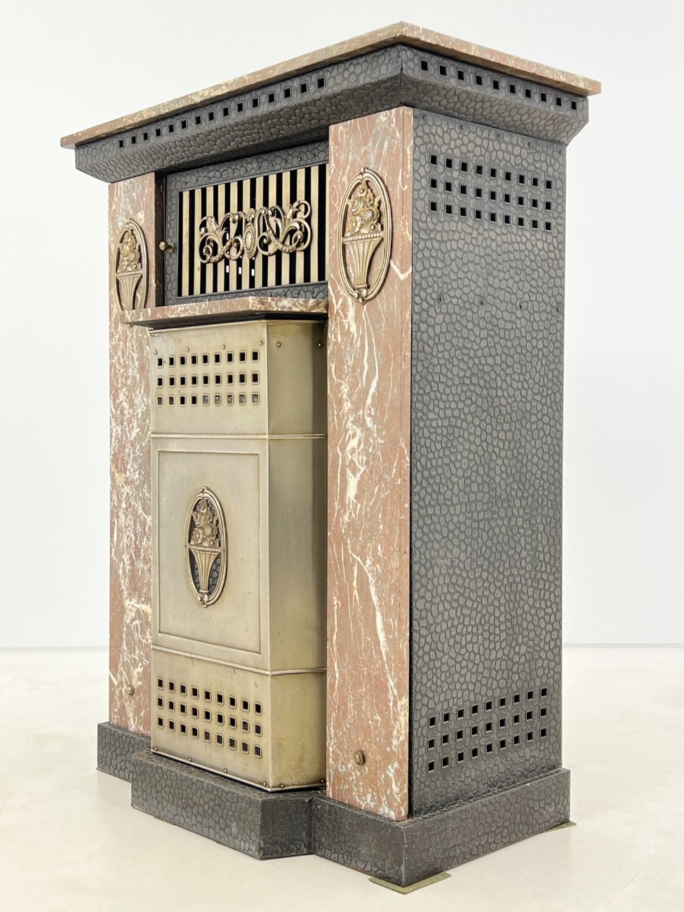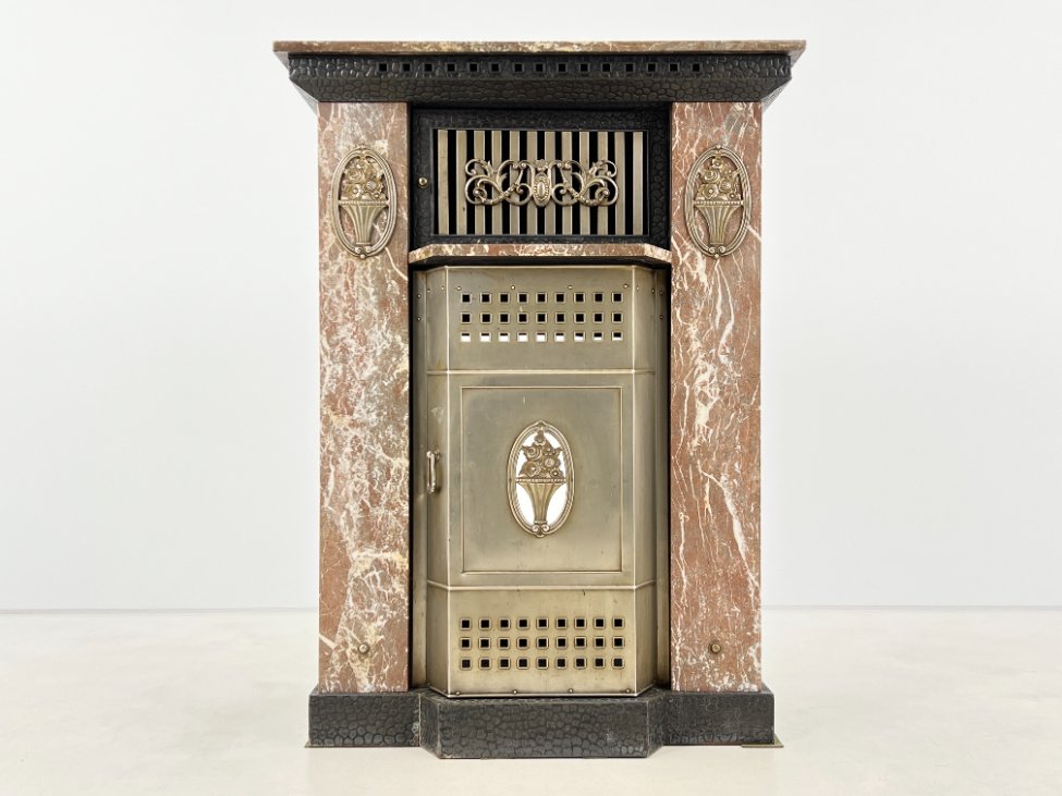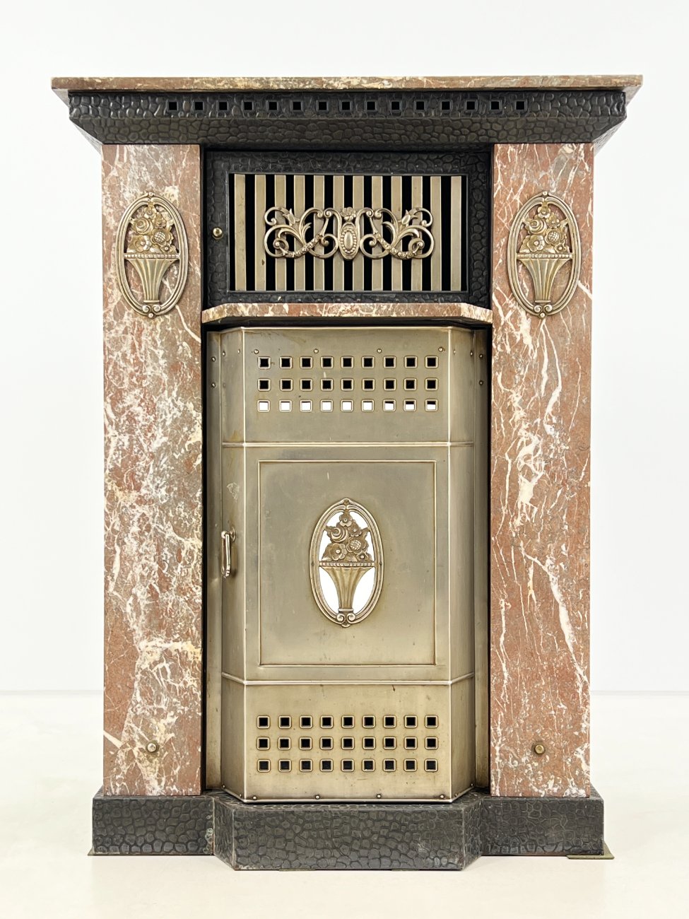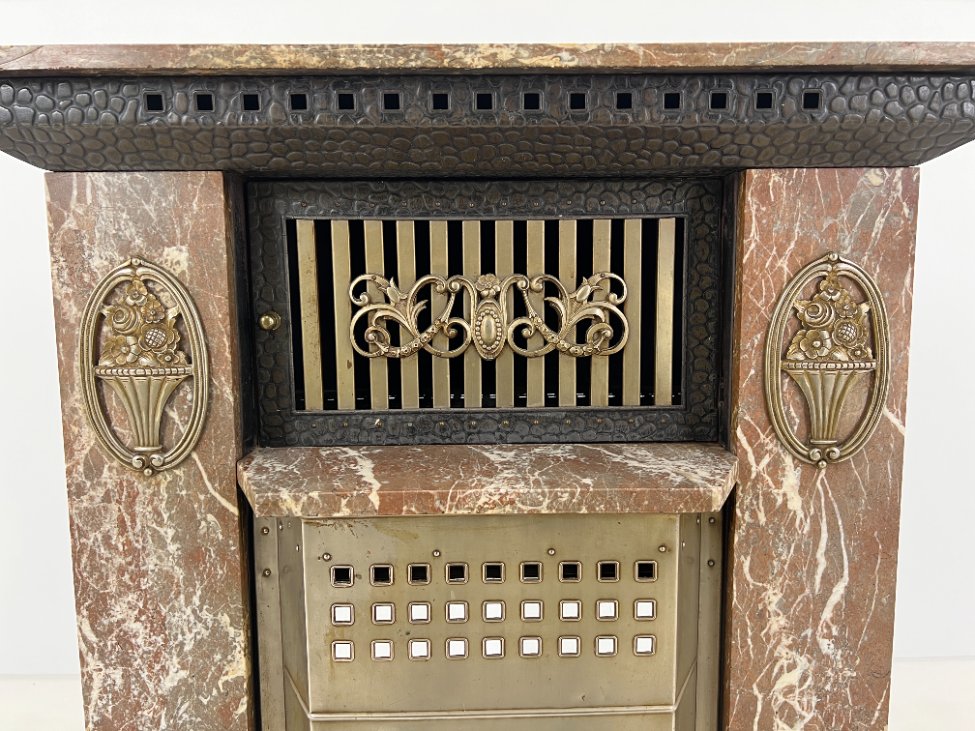 Art Nouveau stiliaus židinio apdaila iš marmuro ir metalo.
