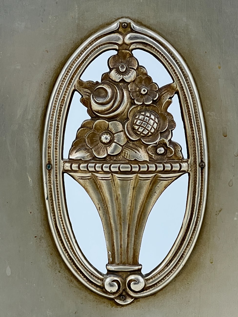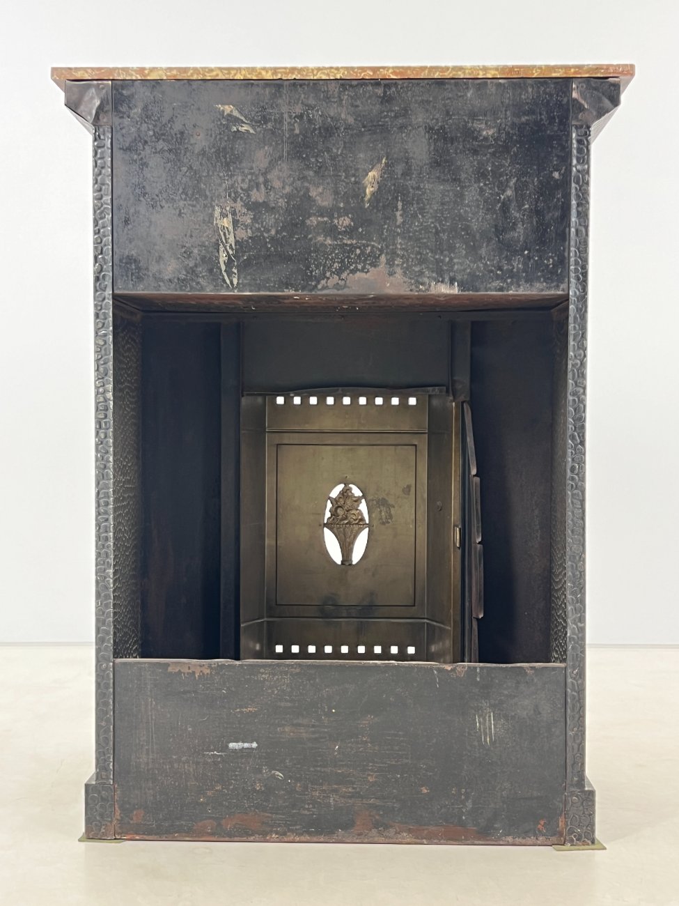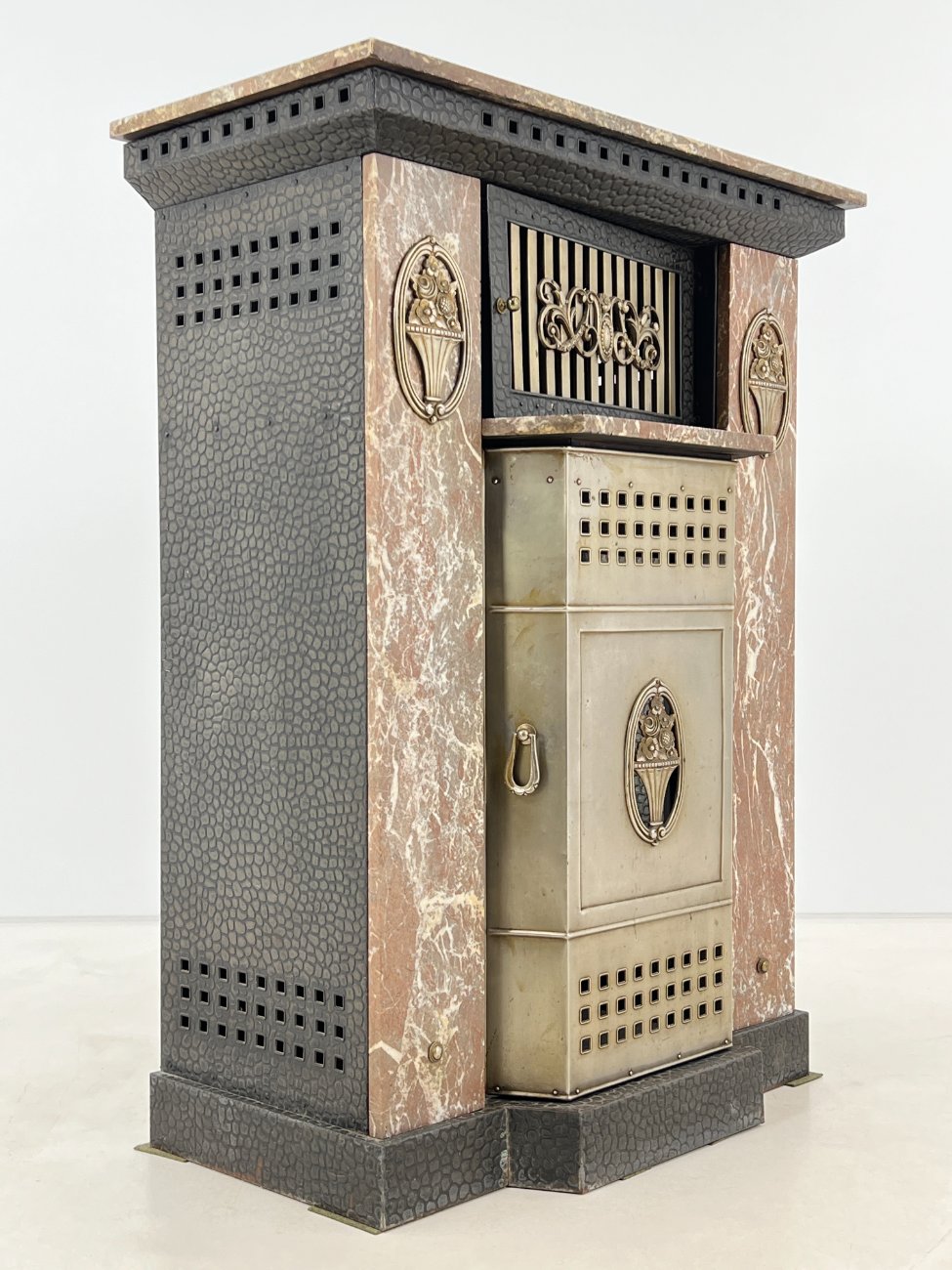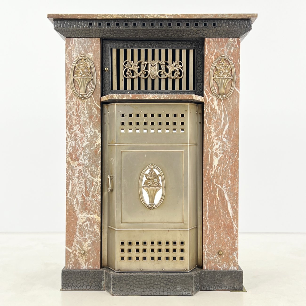 Art Nouveau stiliaus židinio apdaila iš marmuro ir metalo.