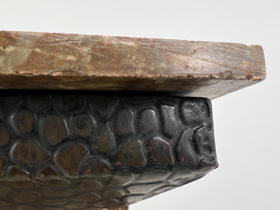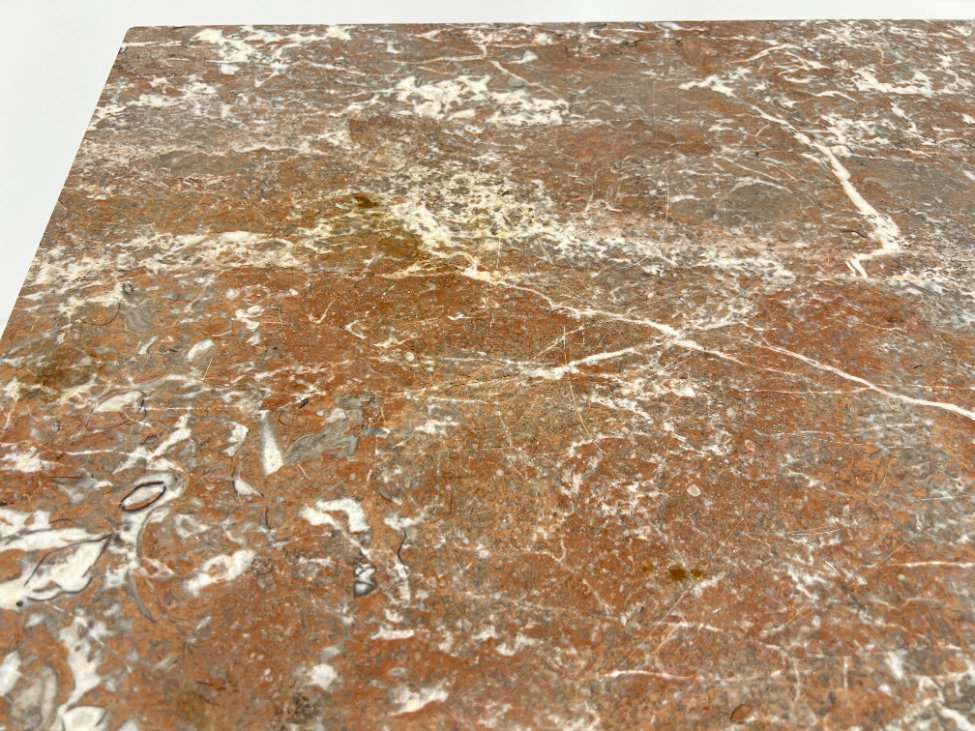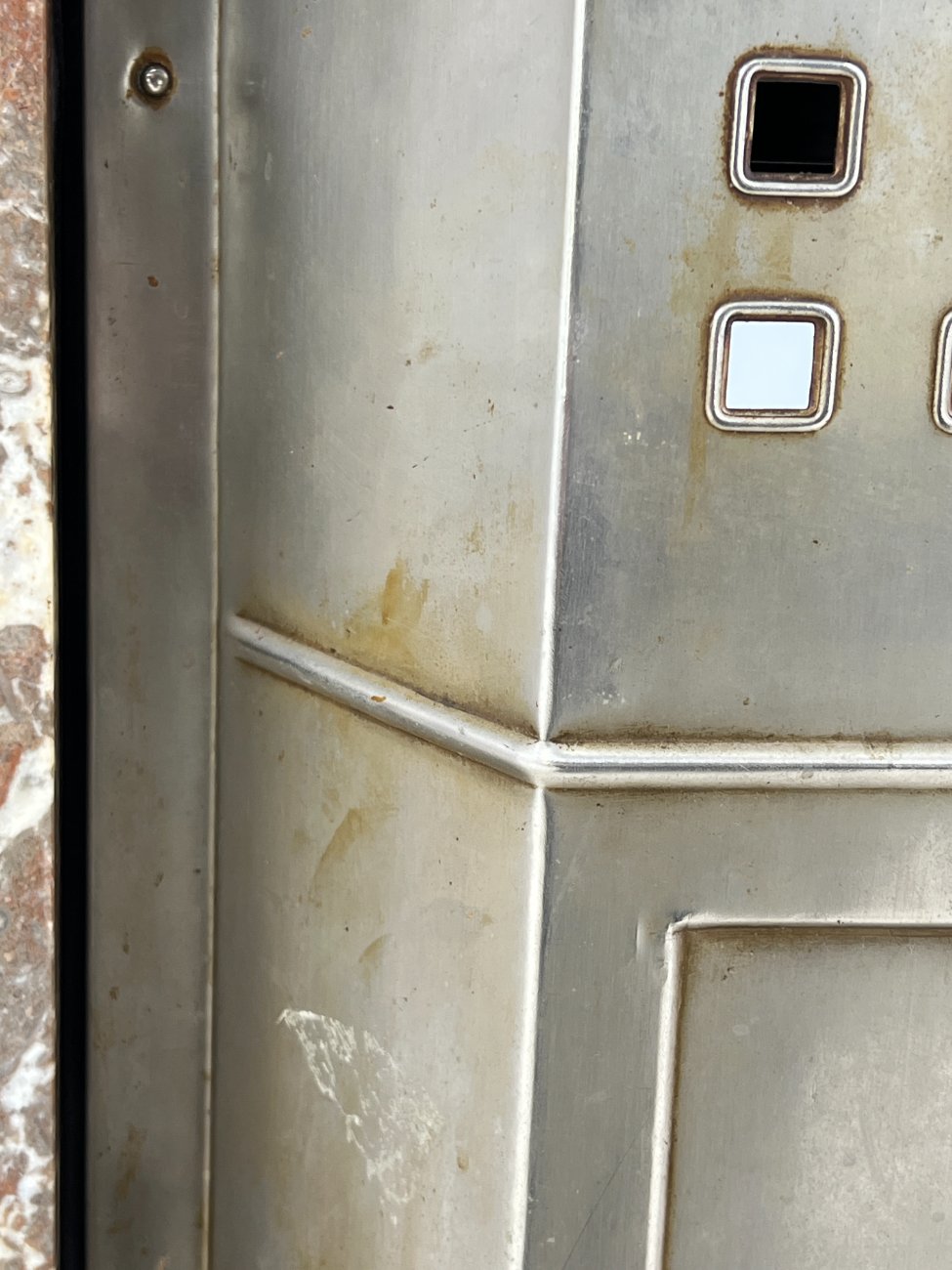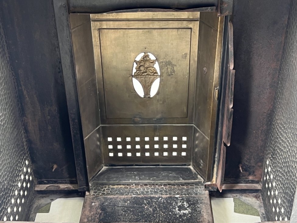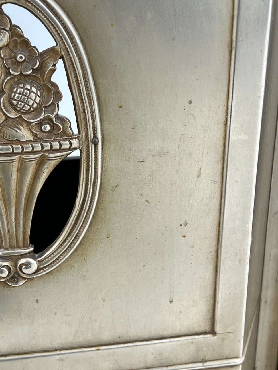 | Papildoma informacija | Matomos naudojimo žymės, stalviršio akmuo pabraižytas, turi dėmių, vietomis apdaužyta kraštinė. Ant metalinių durelių yra įlenkimų ir spalvos pakitimų. |